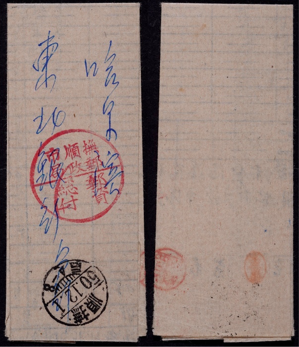 1950年东北抚顺裸寄哈尔滨印刷品,分盖“抚顺市邮政局 邮资总付”二格红色圆戳,抚顺50.12.1梳式日戳,保存完好,非常罕见