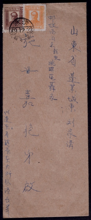 东北区1949年清原寄山东蓬莱封,正贴东北毛泽东像第五版4500元、500元各一枚,东北区国内平信邮资5000元,销清原49.12.23三格下月牙梳式日戳,自然实寄,单戳清,封品完好