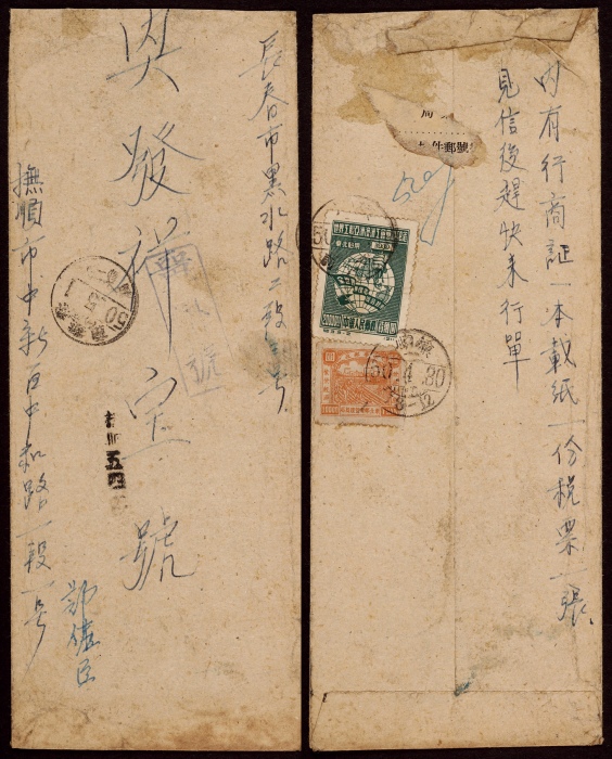 1950年抚顺寄长春挂号封,超重中式封背贴纪3东贴亚澳工联会议2万元及东北区生产图1万元各一枚,销抚顺50.4.30日梳式日戳,正盖“单挂号”邮政副戳及挂号戳,有长春5月1日到达戳,纪东3实寄封少见,保存较好 ...