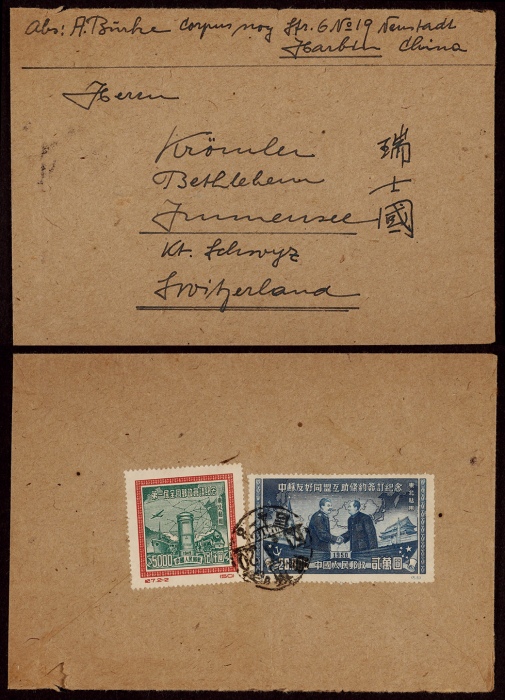 1951年哈尔滨寄瑞士西式封,贴东北贴用纪7邮政会议5000元及纪8中苏友好2000元各一枚,计邮资25000元,销哈尔滨51.7.20日梳式日戳,不同纪东邮票混贴较少见,封品完好