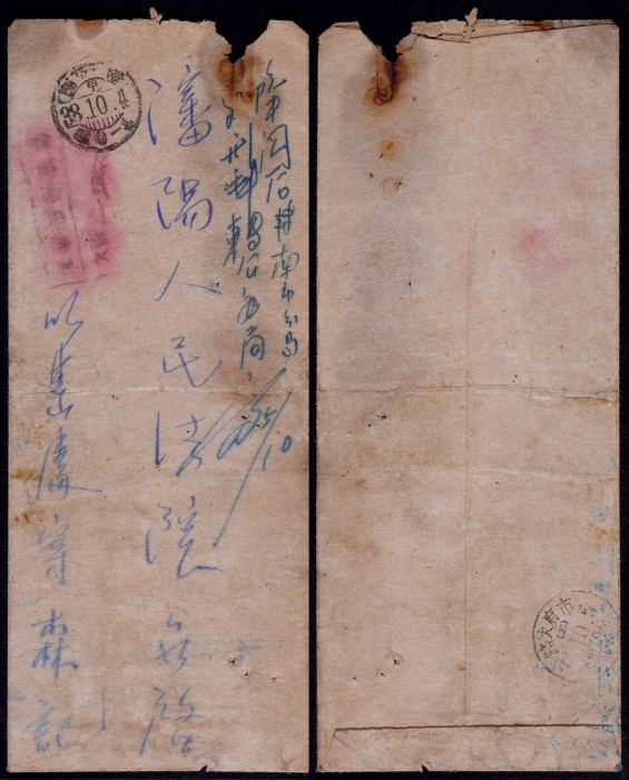东北区1949年沈阳寄本埠欠资封,未贴邮票中式封盖沈阳10.4“甲”型梳式日戳,另盖“沈阳市邮政局欠资”二格戳,背落盖沈阳市府大路10月5日到戳,封品较完整