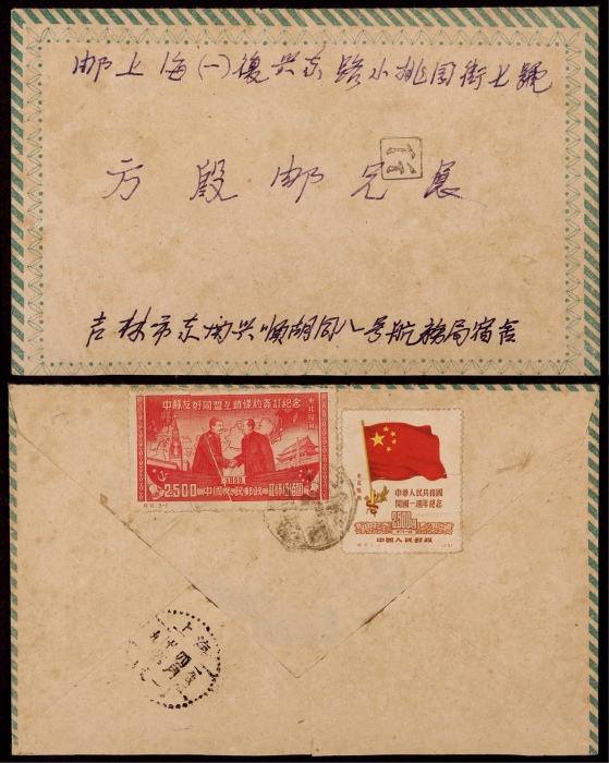 1951年吉林东关寄上海平信封,西式封背贴东北贴用纪6开国周年2500元、纪8中苏友好2500元(邮票中间裂痕)各一枚,计符邮资5000元,销东关4月20日戳(欠清),落地上海1951年4月24日到达戳,封品完整 ...