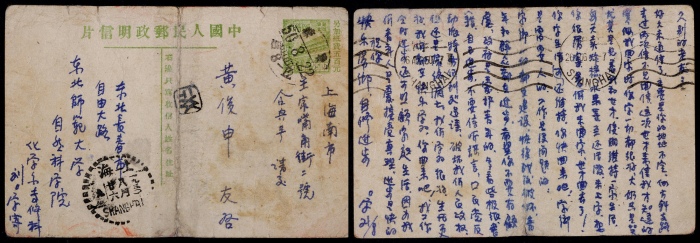 1950年普东1天安门2500元邮资片长春寄上海,销长春8月22日戳,上海8月26日落地戳,片背面盖上海中英文机盖戳,三戳均极清晰,片中间有折痕,略显陈旧,少见