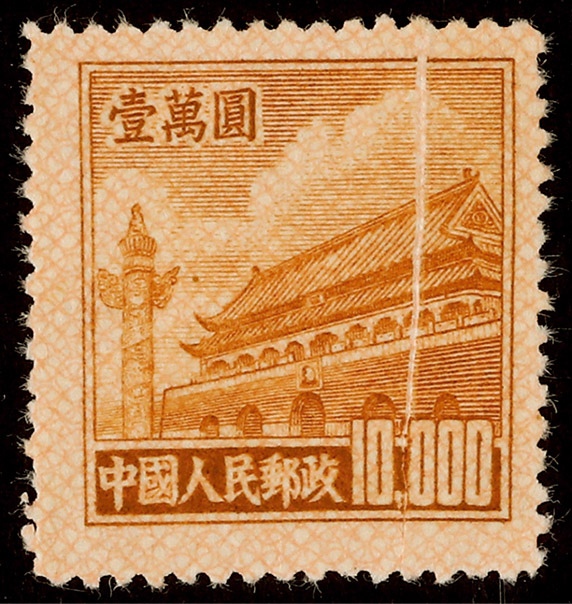 1950年普5天安门壹万元新票一枚,竖向折白变体,上中品,普5变体极罕见,此变体为目前仅见