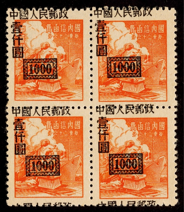 1950年改1(1000元)新票四方连,加盖大移位变体,传统研究组集难得少见素材,上品