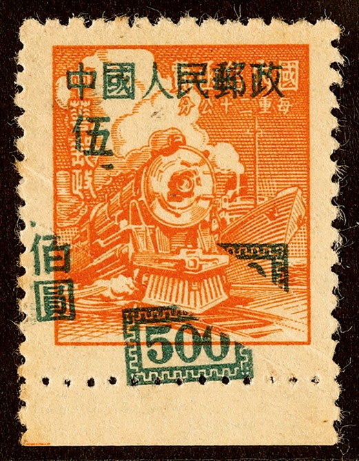 1950年改1-500元新票一枚,折纸加盖大变体,此种加盖变异极少见。邮票展平可见加盖面值分离错位,上品