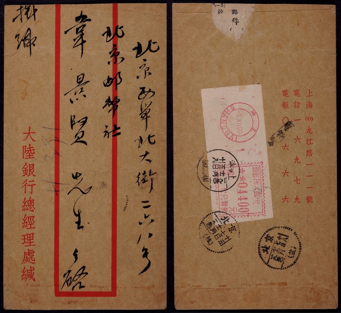 1950年上海寄北京挂号邮资机条封,红框封,背贴沪(四)红色邮资机戳04400元邮资已付条,另盖上海(甲)十二月五日日戳,有北京十二月七日(挂)字中转及当日北京(廿二)落地到戳各一枚,邮资机条少见,封品完好 ...