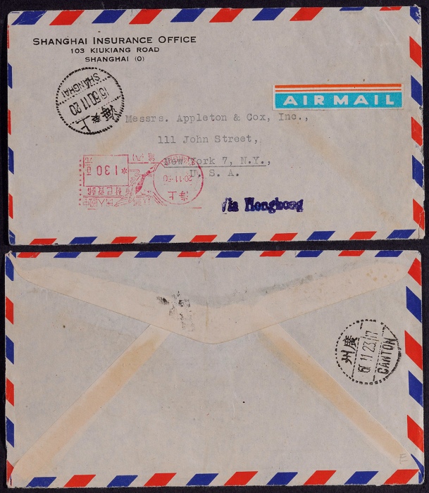 1950年上海寄美国航平封,正盖“中国人民邮政邮资已付130百元(沪八)50.11.20”低头飞雁图红色邮资机戳,另盖上海50.11.20日戳,广州11.23中英文中转戳,封品完好