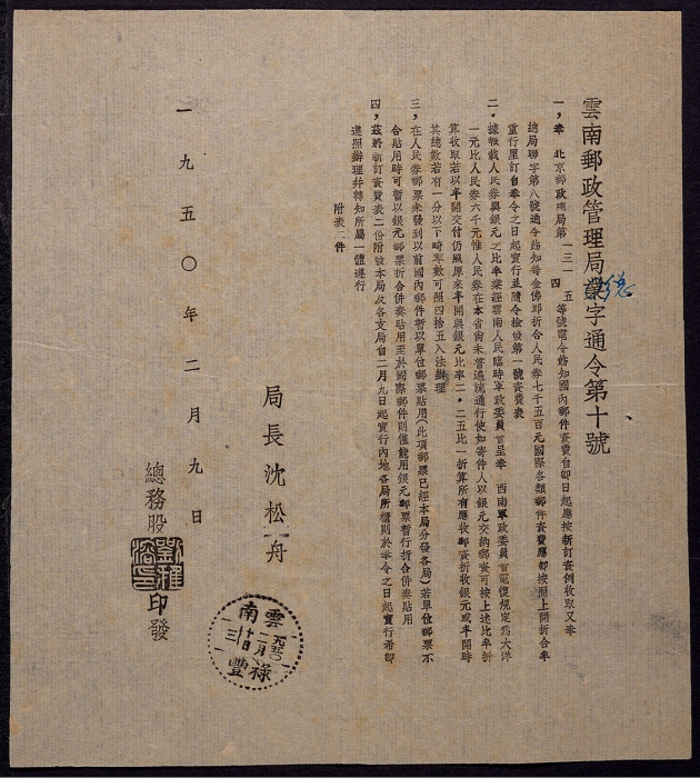 1950年云南邮政文件一份,主要内容:关于人民券邮资与中华邮政银圆及半开银圆邮资比率规定实施使用事项,盖云南禄丰1950年2月10日戳,新中国初期邮史研究好素材,较少见,保存完好