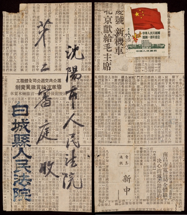 1950年白城县寄沈阳封,报纸糊制中式法院公函封,贴纪6东贴大国旗5000元一枚,销白城50.11.3日梳式日戳,单戳较清,自然实寄,保存完好