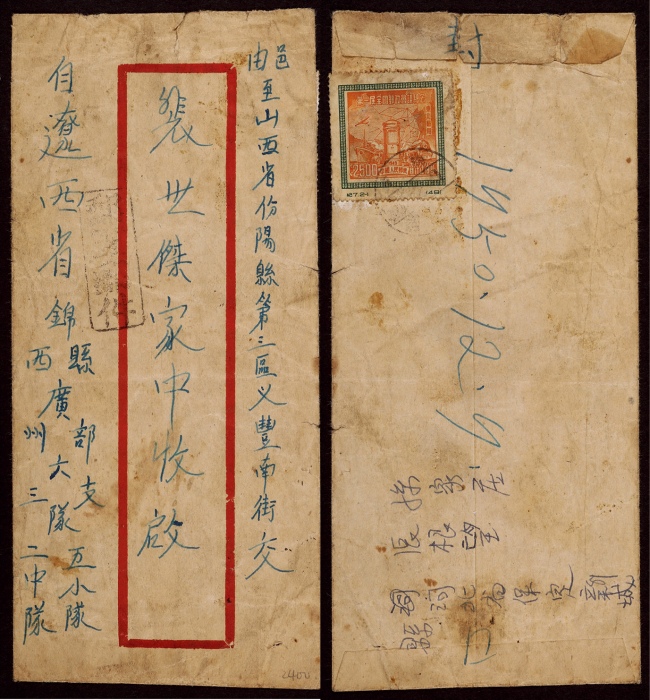 1950年辽西寄山西汾阳“优军优件”封,红框封,由辽西省锦西县广州部六三支队发山西汾阳,背贴纪7东贴邮政会议2500元一枚,销锦西12月9日小三格日戳,另盖“优军邮件”长框戳,保存较好