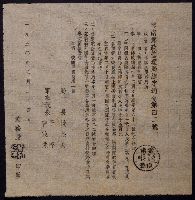 1950年云南邮政文件一份,主要内容:调整国际邮资事项,盖云南禄丰1950年3月27日戳,保存完好