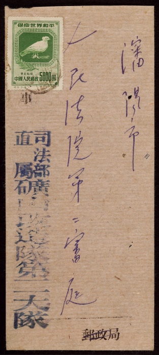 1950年沈阳寄本埠封,正贴纪5东贴保卫世界和平5000元一枚,销沈阳50.1.2日戳,发本市法院,封品完整