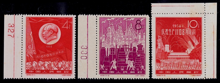1958年纪58钢铁生产新票全套3枚,带数字等纸边,发行无胶未贴,微黄,上中品