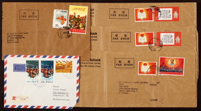 1967-74年实寄德国国际封一组5件,其中北京寄出四件:1967年贴文2小招手8分、特56蝴蝶30分各一枚;1968年三件,其中2件贴文11林彪题词8分+纪119亚非会议22分,一件贴文5沙家浜8分(角残)、纪119-22分;另一件上海寄出印刷品航挂封,贴文18雪夜8分、43分及T3户县画8分各一枚, ...