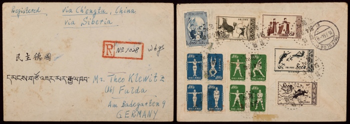 1954年西藏拉萨寄德国挂号封,中型西式封书写汉、藏、英三种文字盖“R NO(1028)”红色挂号戳,背贴特3伟大祖国全套4枚,纪23-400元一枚,特4广播体操原版(40-5-8)、(40-13-16)各四方连,销拉萨54.4.20汉藏三格全点线日戳,有德国54.7.15到达戳,少见邮品,保存完好 ...
