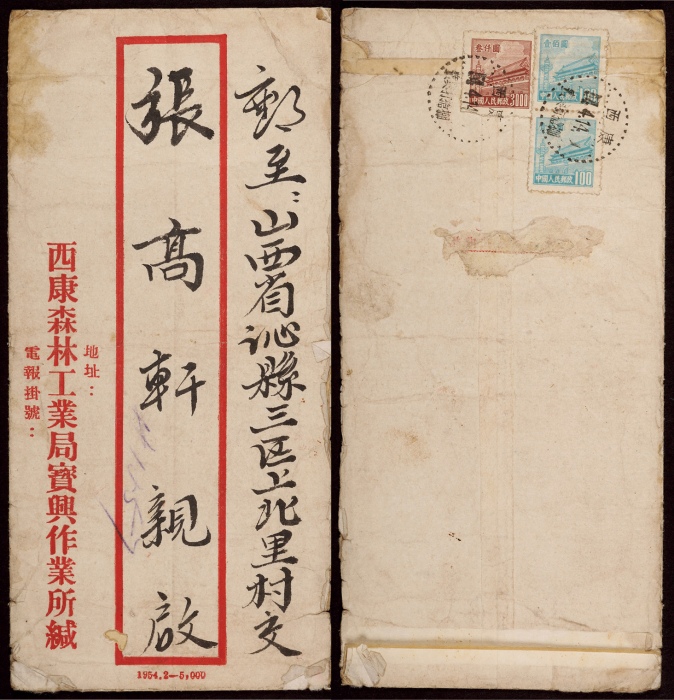 1954年西康宝兴打抢棚寄山西沁县双挂号封,红框公函封背贴普4-3000元一枚及100元两枚,计符国内双挂号信函邮资3200元,销西康宝兴打抢棚54.4.14三格全点线日戳,西康小地名戳,双挂封较少见,保存完好 ...
