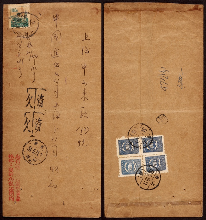 1954年深圳寄上海欠资封,中式牛皮纸较大封,正贴普6-800元一枚,销深圳(甲)54.5.11日戳,此封超重,因欠资,另机盖“T欠资”戳,封落地上海背贴蓝欠资邮票1000元三枚、200元一枚,注“47公分/3200”并销盖上海(箱)54.5.15邮政日戳,封品完好 ...