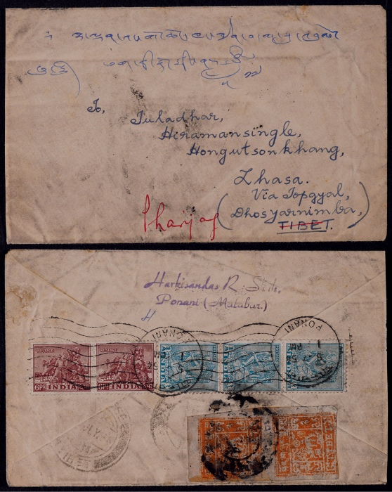 1954年印度寄西藏帕里崇封,西式封背贴印度普票5枚,机盖浦那7.5波纹七线戳,落地进口加贴西藏地方邮票两枚,封面英译加注藏文收件人地址,转发帕里崇,保存较好