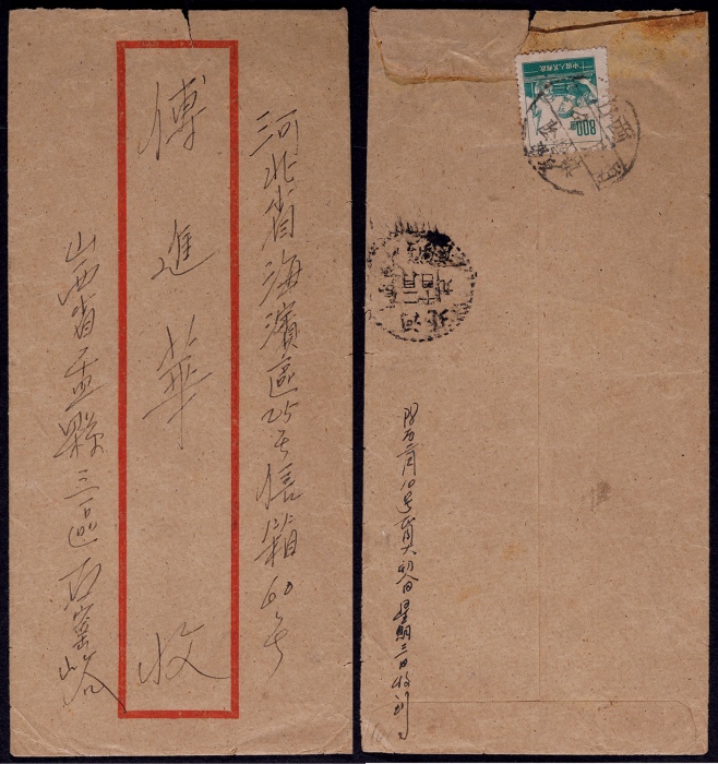 1954年山西阴营镇寄河北北戴河双地名封,红框封背贴普6-800元一枚,销“山西阴营镇/阳泉 年 月 日”三格双地名手填戳,落地河北北戴河2月10日到达戳,有原信,保存较好