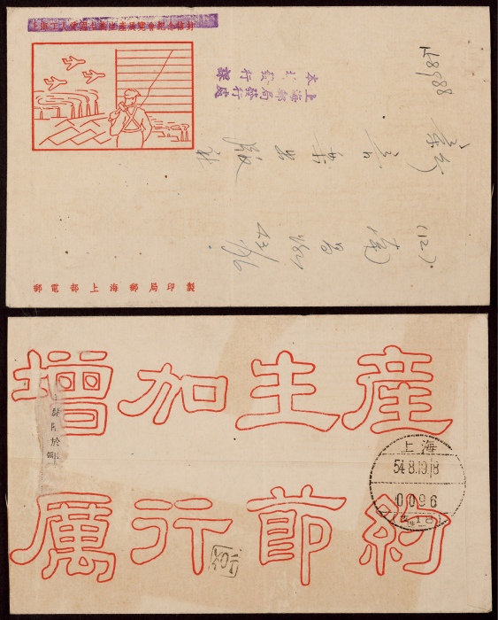 1954年上海寄南昌邮电公事挂号使用纪念封,邮制“上海工人爱国主义生产展览会纪念信封”背印“增加生产、厉行节约”空心字宣传语,盖上海(支18)进一54.8.19大型四格款式“0096”号邮政日戳,贴有挂号执据残根,落款上海邮局发行处挂号:“158988”寄南昌,少见品。保存完好 ...