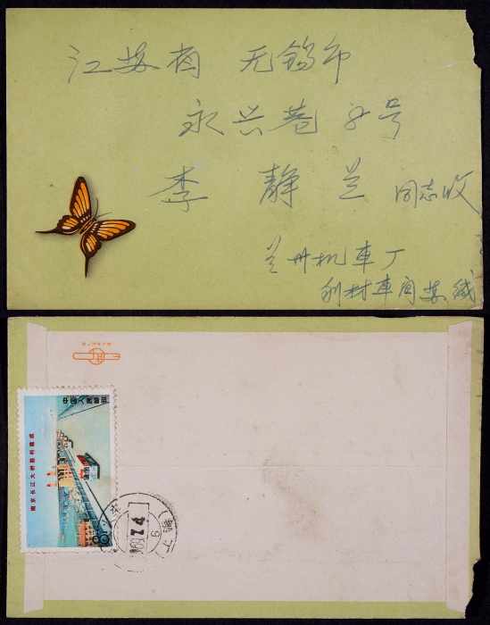 1969年兰州寄江苏无锡火车邮局封,背贴文14长江公路桥8分一枚,盖沪兰火车(上海)7月4日戳,单戳清,封品完整
