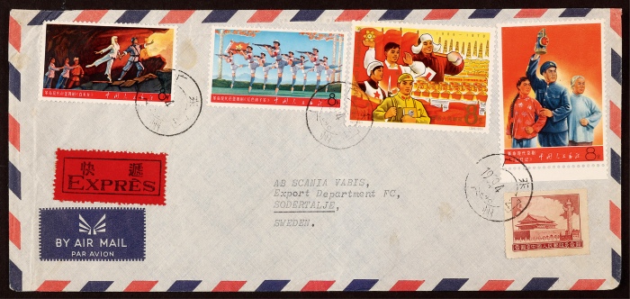 1969年广州寄瑞典航快封,航空封贴文7白毛女、红色娘子军、红灯记各8分一枚,纪118三五计划8分一枚,普9-1元一枚,计邮资132元,销广州4.2日戳,另贴红底黑字“快递”双文字签条,票佳戳清,封品完好 ...