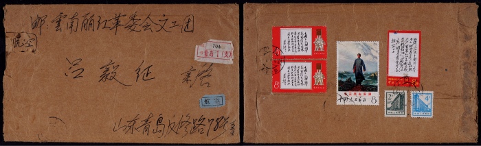 1969年山东青岛寄云南丽江超重航空挂号封,自制牛皮纸封背贴文7茫茫8分、文12去安源8分、普13-2分、4分各一枚,文11题词8分两枚,计邮资38分(信函8分+续重8分+挂号12分+航空2分×5)相符,销青岛1969年1月1日戳,另贴青岛1(支)704号挂号条、航空条,封品完整 ...