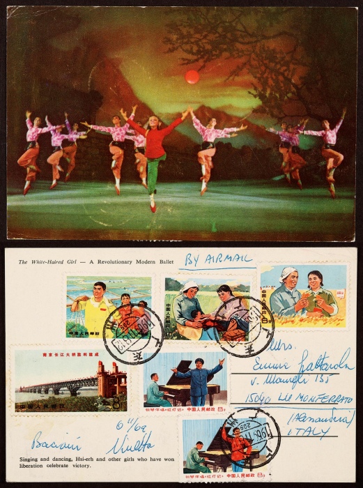 1969年广州寄意大利航空明信片,贴用当年发行文14南京长江大桥4分及8分两枚、文17知识青年10分、8分及文16铁梅唱8分,六枚票计资46分,销广州11.8戳,片背彩图:白毛女剧照,片品完好