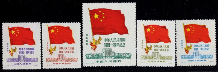 1950年纪6中华人民共和国成立一周年纪念东北贴用原版新票全套5枚,发行无胶未贴,上中品