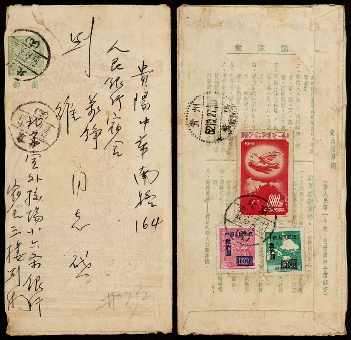 1952年普4北京风景白塔图邮简北京挂号寄贵阳,背加贴纪18-800元、改1-100元及300元各一枚,挂号邮资1200元,销北京(十九)10月19日三格式日戳,落地贵阳10月27日到戳,此简当年发行次日实用例较少见,局部小裂,整体较好 ...