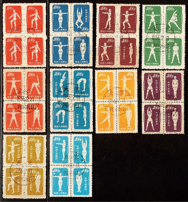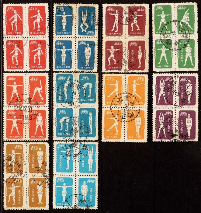 1952年特4广播体操原版盖销旧票全套40枚,各四方连分盖,1955.12.31汉英三格日戳,上中品