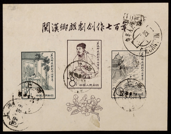 1958年纪50关汉卿戏剧创作小型张信销旧票一枚,销上海1958.8.24上海日戳、广州8.29国际函件带国名双文字日戳,自然实寄,上中品