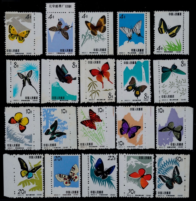 1963年特56蝴蝶新票全套20枚,带纸边,微黄,上中品