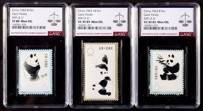 1963年特59熊猫有齿新票全套3枚,ASG评级80-85分