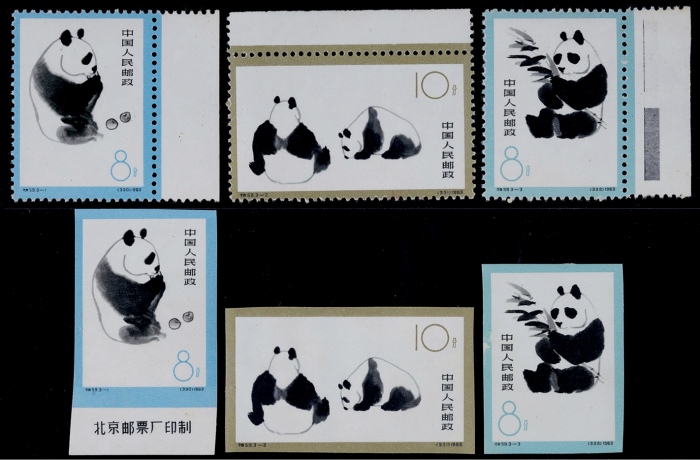 1963年特59熊猫有无齿新票全套各3枚,原胶未贴泛黄,中上-上中品