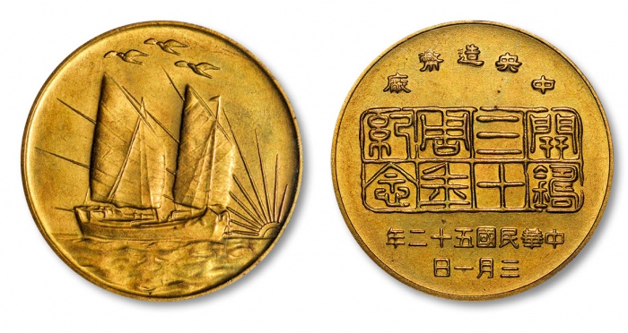 1963年中央造币厂“开铸三十周年纪念”章一枚,黄铜制,背为“帆船三鸟”银币图,图案打制清晰完美,底板平滑光洁,原色铜光,保存上佳,品相一流,金盾PCGS MS63(38566556)
