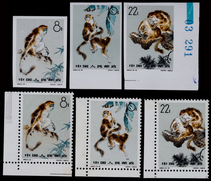 1963年特60金丝猴有无齿全套各3枚,原胶未贴部分泛黄,中上-上中品