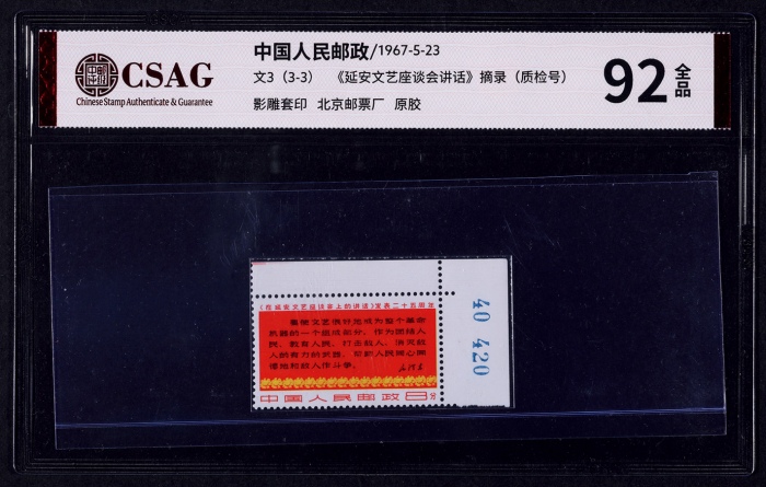 1967年文3延安座谈四行半新票一枚,带右上直角数字纸边,中邮评级92分全品