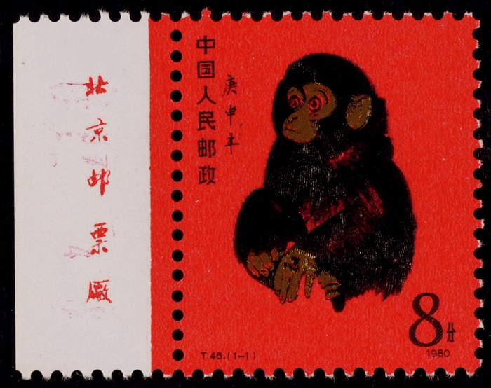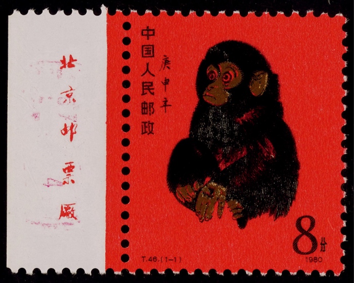 1980年T46庚申年“猴”新票一枚,带左厂铭纸边,原胶未贴,上品