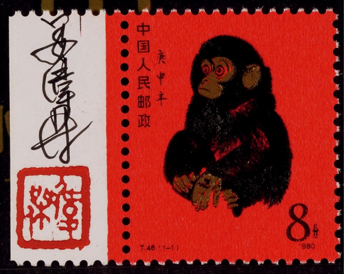 1980年T46庚申年“猴”新票一枚,带左边纸并有雕刻师“姜伟杰”亲签钤印,原胶未贴,上品