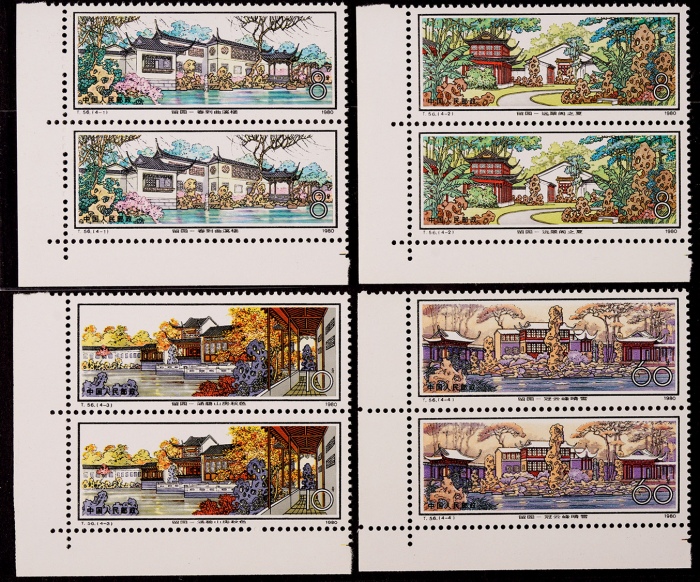1980年T56留园新票全套双连,带左直角边纸,原胶未贴,上品