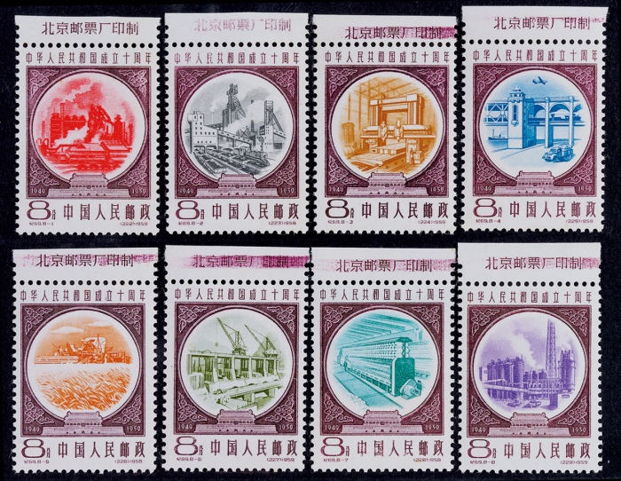 1959年纪69中华人民共和国成立十周年新票全套8枚,带上厂铭纸边,原胶未贴微黄,上中品