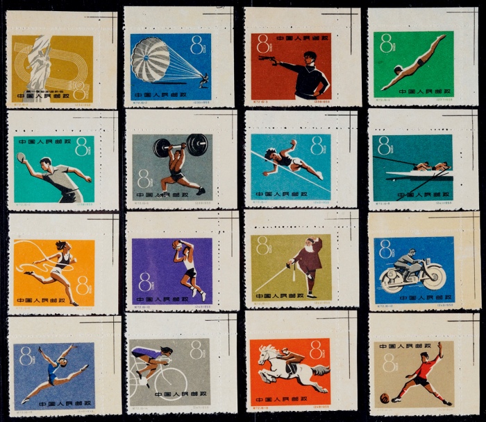 1959年纪72第一届全国运动会新票全套16枚,带右上直角边纸,发行无胶未贴,上品