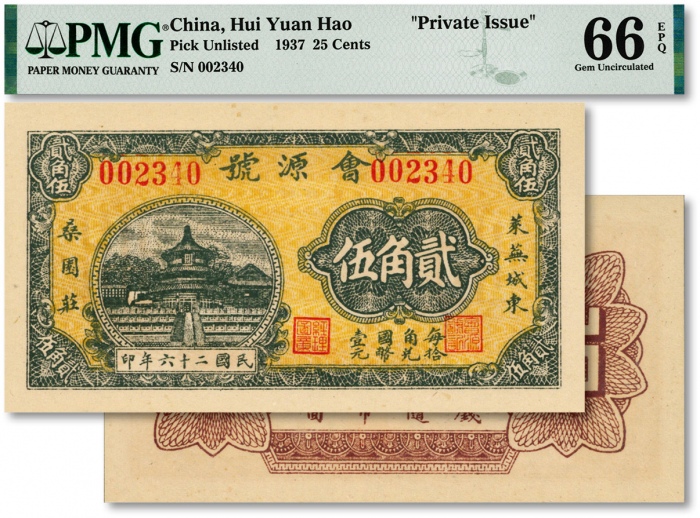 民国二十六年(1937年)山西省银行拾圆,山西地名,纸张硬挺,纹路清晰,色彩浓郁纯正,好品相,全新(低评,为数寥寥之季军分,更高分仅2枚)