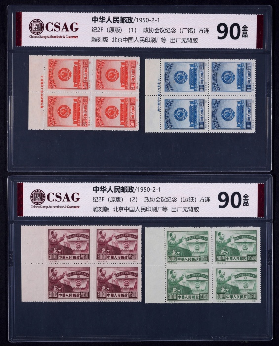 1950年纪2政治协商会议原版新票全套四方连,部分带厂铭纸边,中邮评级90分全品<br><br>中邮评级邮票 11620-11649<br>中邮评级(CSAG)成立于2021年,目前已经完成约30万枚中国邮票的评级业务,内容涵盖清代、民国、解放区、新中国这四大板块的邮票、邮政用品和实寄封,获得资 ...