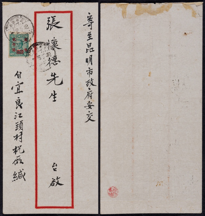 1948年宜良寄昆明火车邮局封,红框封贴重庆大东版孙中山像国币改值2000元,合符平信邮资,销个壁火车邮局48.2.12英汉双文字三格式日戳寄昆明,火车运行中邮务人员销票盖戳二枚,十分自然,背钤那家佑藏印,保存完好 ...
