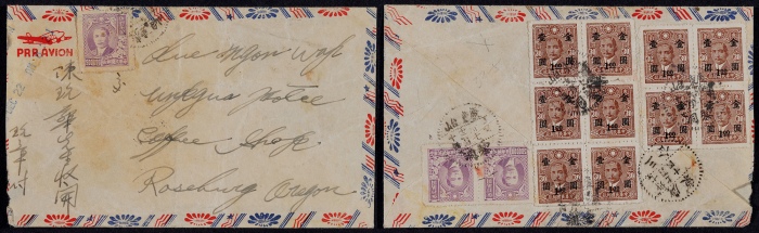 1948年绥远萨县寄忻县航空封,贴重庆大东版孙中山像国币改值2000元六方连,计符邮资12000元,销绥远萨县五月卅一小三格全点线日戳,经绥远归绥六月一日中转,保存完好,带展页