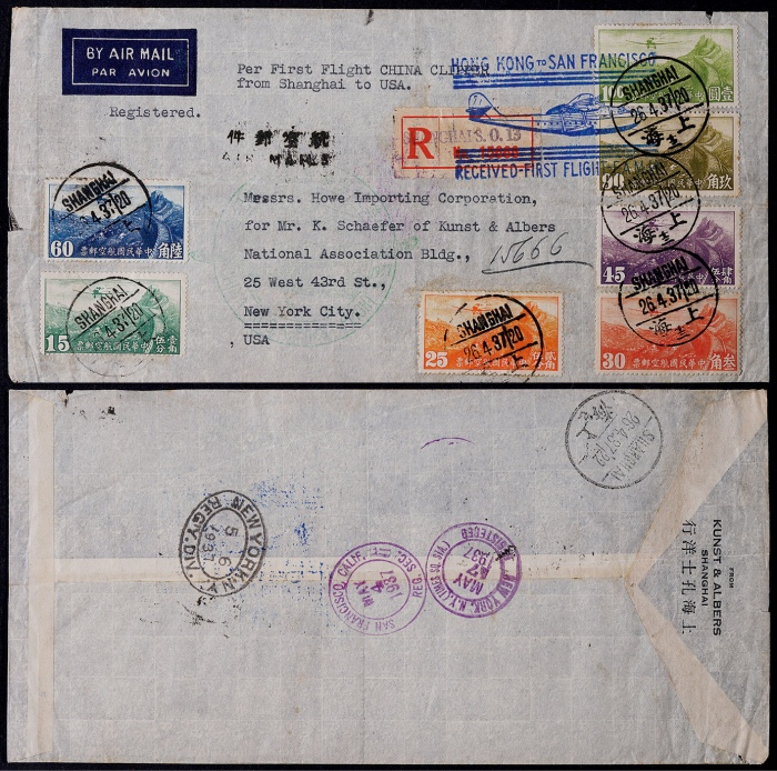 1937年上海寄美国首航挂号封,贴北平三版航空60分、15分、25分、30分、45分、90分、1元各一枚,并贴R上海挂号签条,盖英文飞机图英文首航蓝色纪念戳,销上海37.4.26英汉三格日戳,背盖美国5月4日-5月6日中转及5月7日到达戳,保存完好 ...