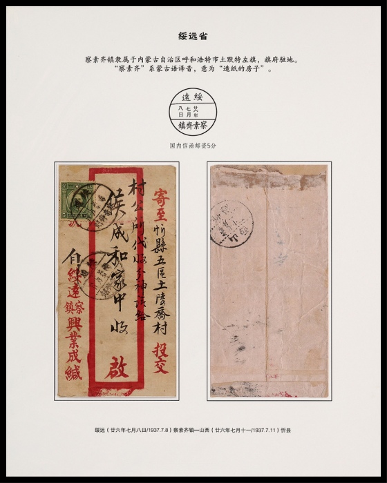 1937年绥远察素齐镇寄忻县封,绥远察镇兴业成红框封,贴伦敦版孙像单圈5分一枚,销绥远察素齐镇七月八日三格日戳,落地山西忻县七月十一日到戳,绥远有趣小地名封,保存完好,带展页